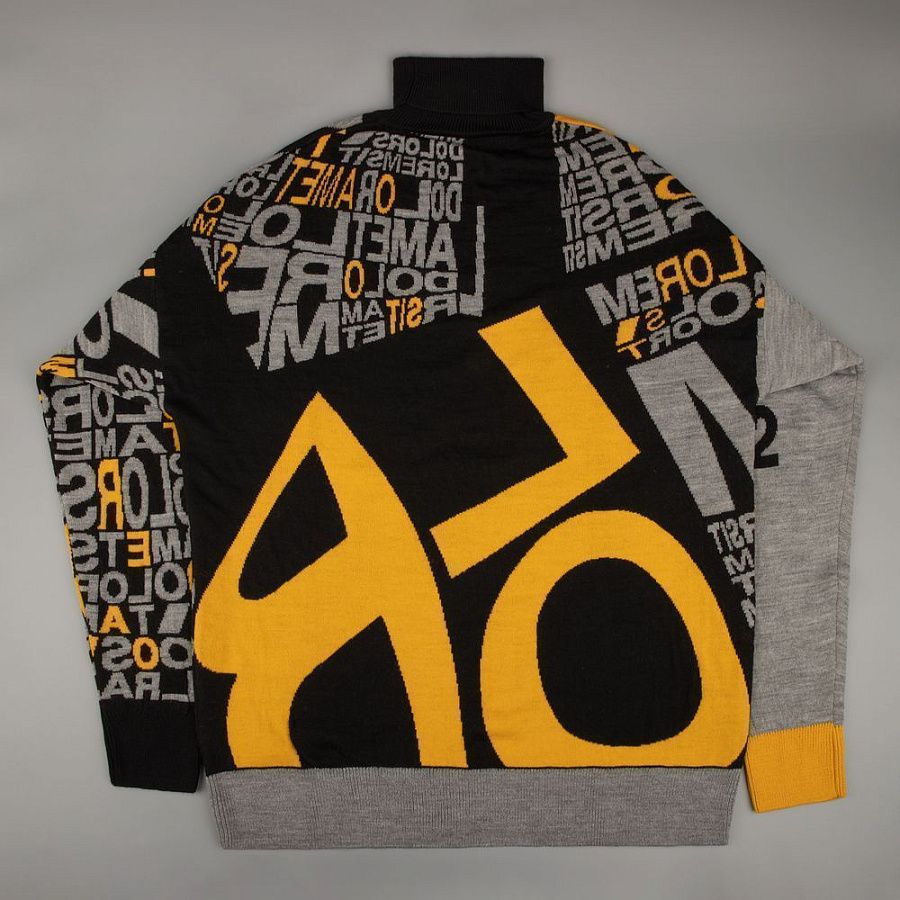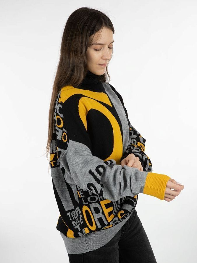 Свитер унисекс с вывязанным логотипом и индивидуальным рисунком в фирменной цветовой гамме.