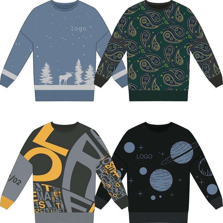 – на однотонных пространствах можно «разделить» полотно (кажется, что свитер двуслойный), поэтому рекомендуется не оставлять больших однотонных площадей.