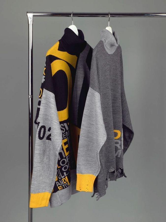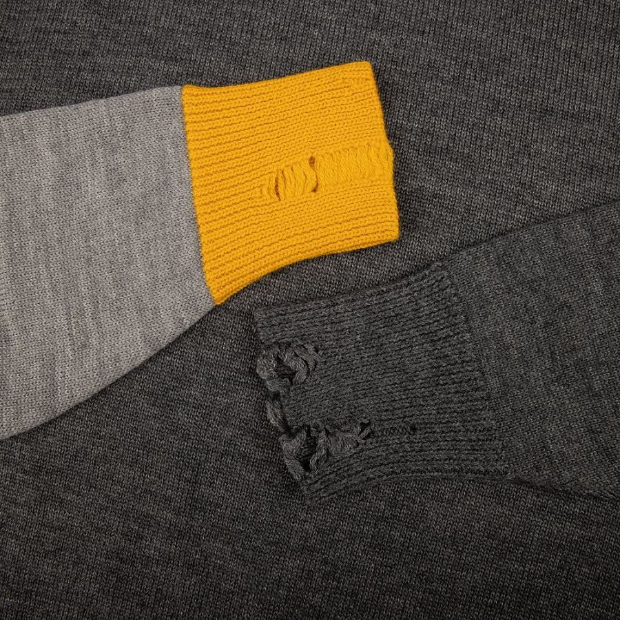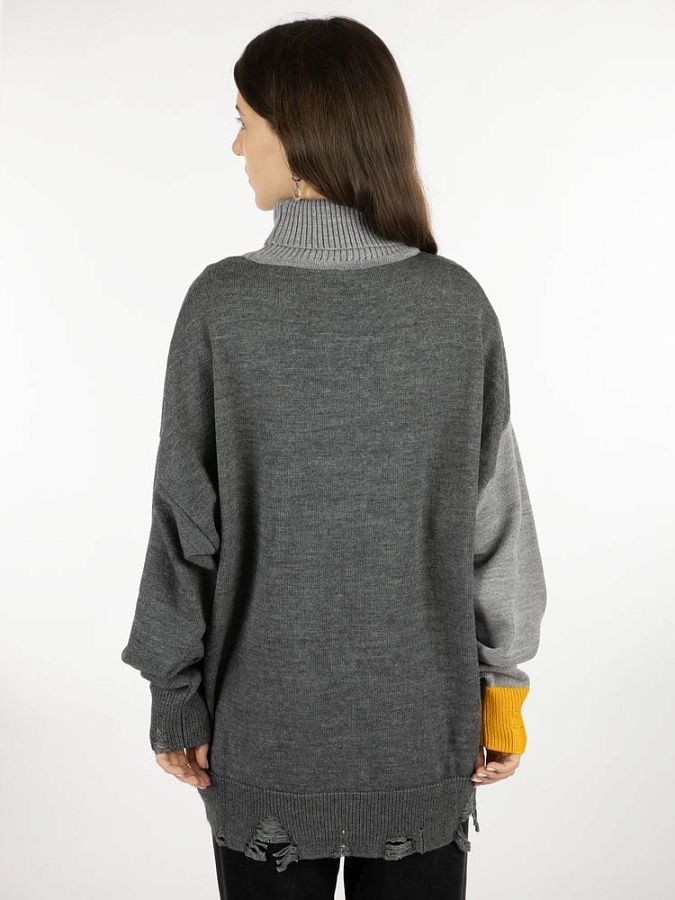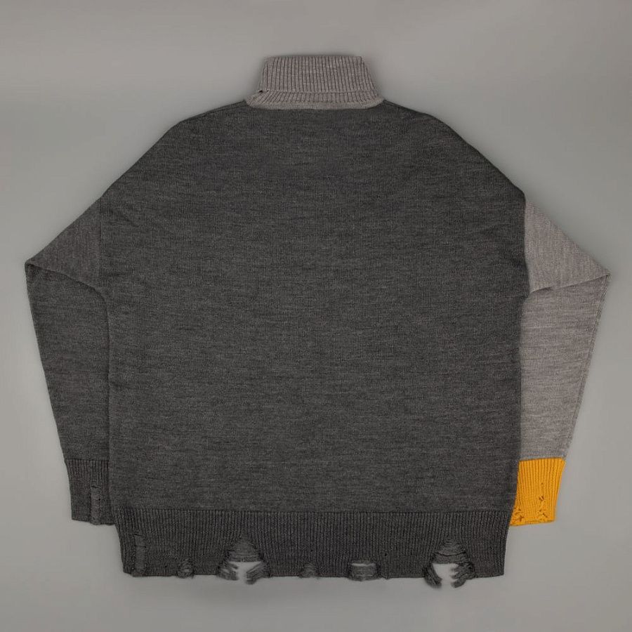 Модель: однотонный гладкий свитер унисекс, спущенное плечо. Ворот, манжеты и низ изделия вывязаны резинкой c добавлением эффекта «рваного» края.