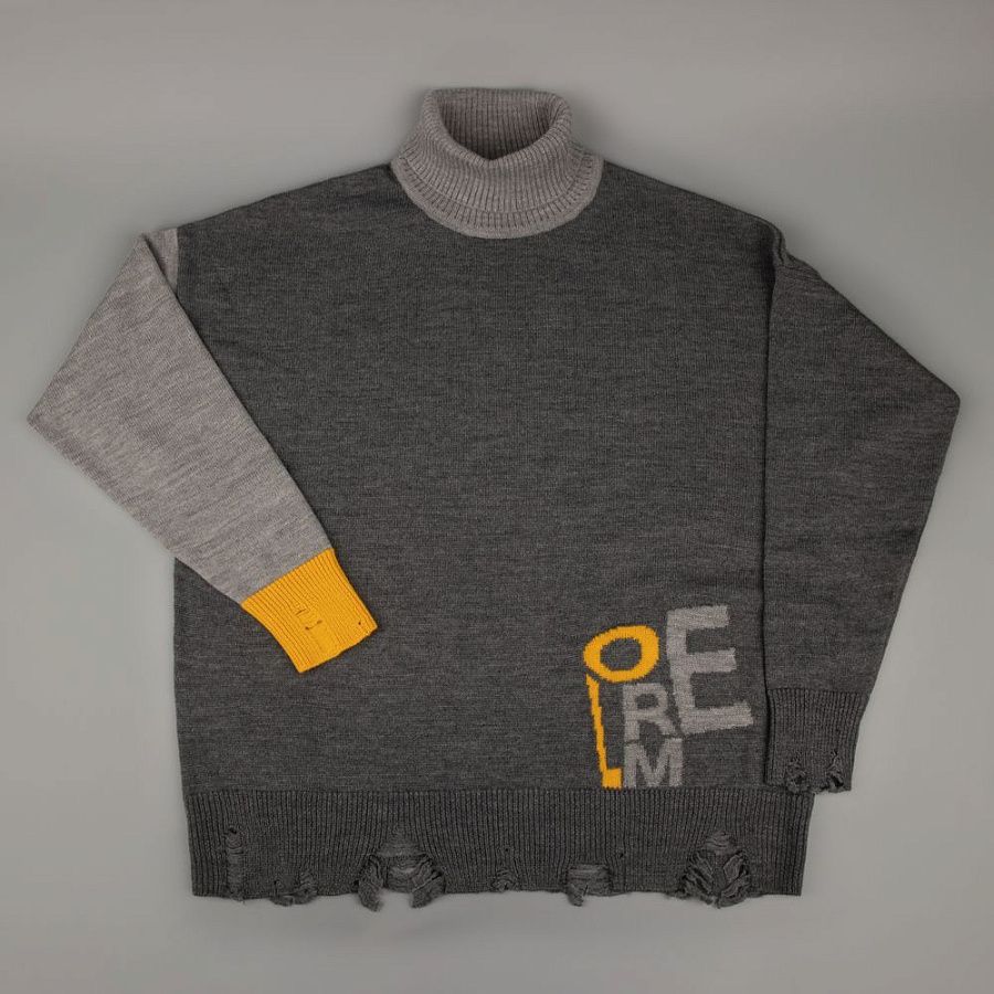 Свитер унисекс с вывязанным логотипом и индивидуальным рисунком в фирменной цветовой гамме.