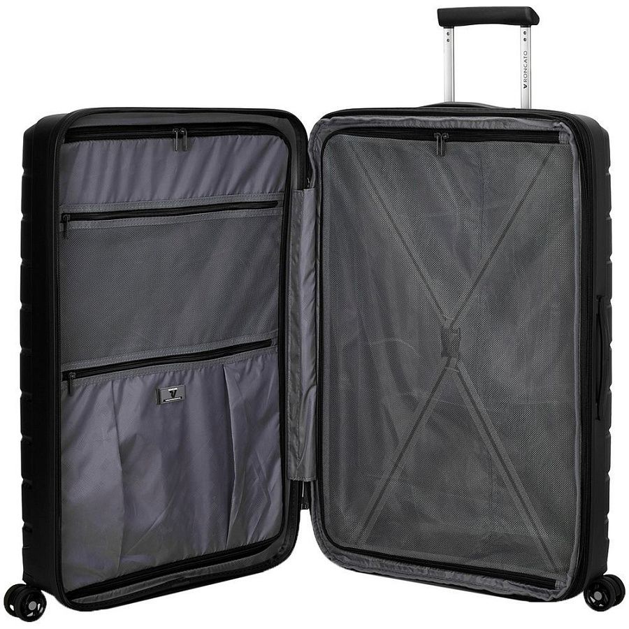 - Чемодан с 2 отделениями: одно отделение с сетчатым разделителем и прижимными ремнями, а второе оснащено перегородкой на молнии с двумя карманами