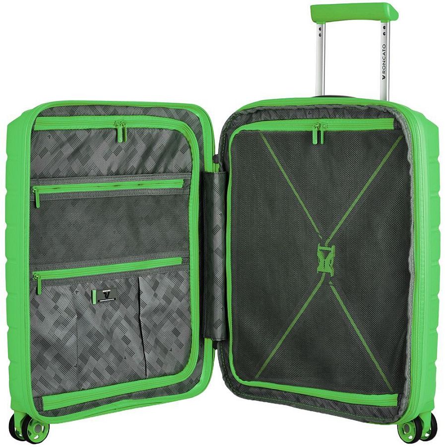 - Чемодан с 2 отделениями: одно отделение с сетчатым разделителем и прижимными ремнями, а второе оснащено перегородкой на молнии с двумя карманами