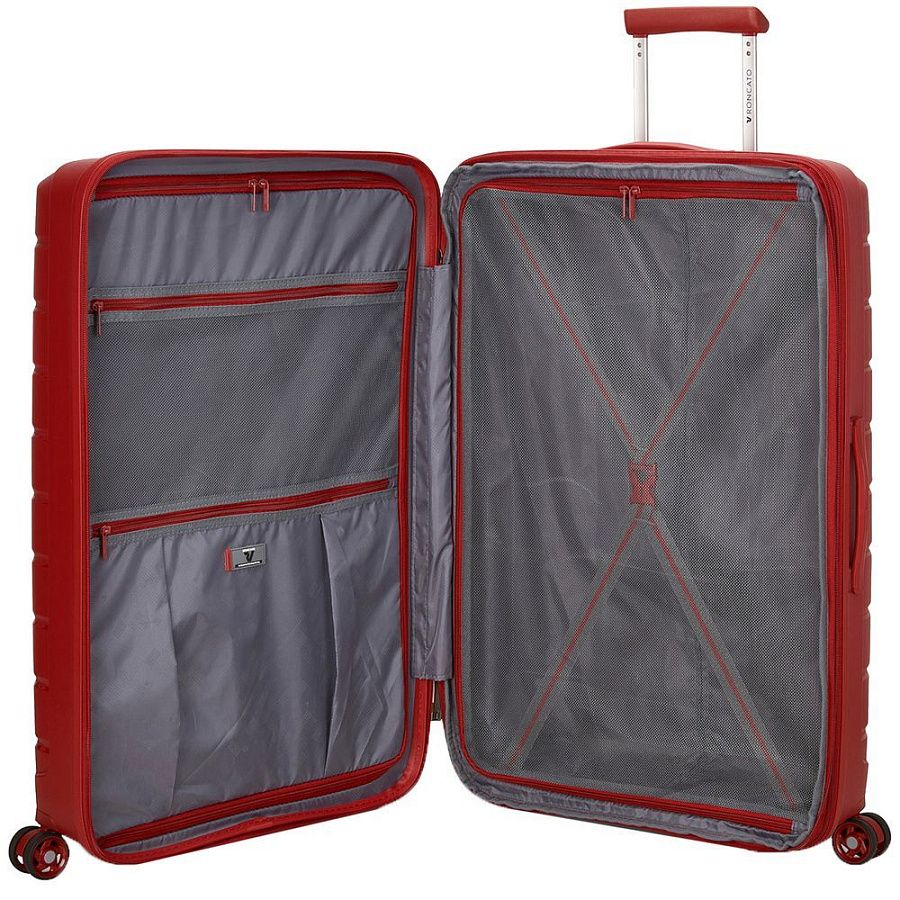 - Чемодан с 2 отделениями: одно отделение с сетчатым разделителем и прижимными ремнями, а второе оснащено перегородкой на молнии с двумя карманами