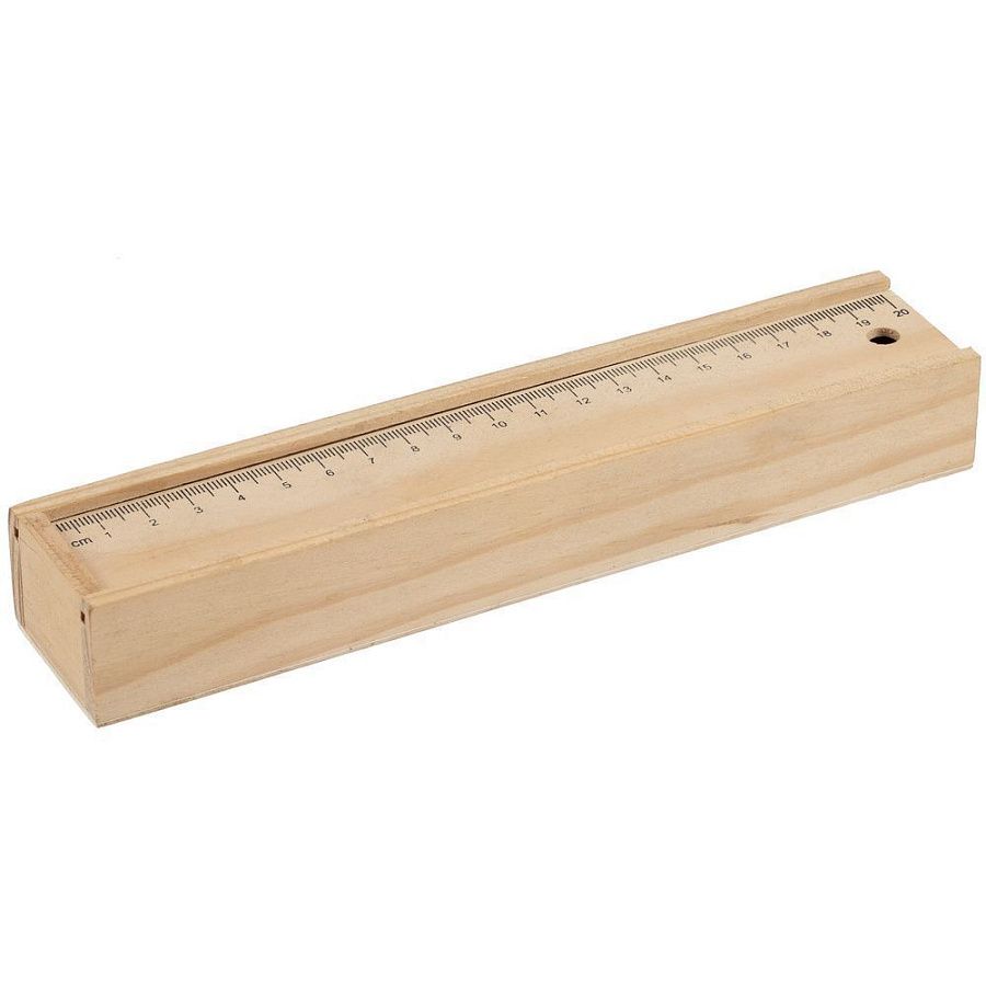 Набор из восьми цветных карандашей, точилки и ластика в деревянном пенале с крышкой-линейкой.
