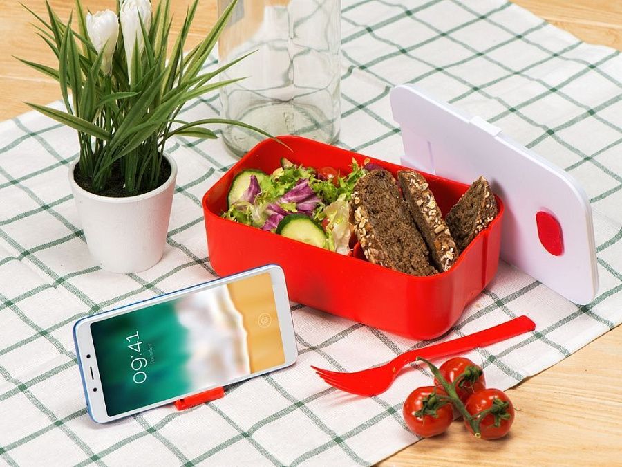 Ланч-бокс "Neo" можно брать с собой на работу, в школу, университет и командировки. Внутри прочной пластиковой емкости находятся снимаемая перегородка и вилка. Крышка с клапаном препятствует выпадению продуктов из бокса. Чтобы облегчить открытие контейнера, сначала выпустите воздух из него, потянув за силиконовый клапан на крышке. Деталь для фиксации крышки контейнера выполняет дополнительную функцию подставки для телефона, что особенно понравится тем, кто привык смотреть видео или читать книги во время перекуса. Ланч-бокс "Neo" можно разогревать в микроволновой печи, предварительно сняв крышку контейнера. Также разрешается использовать в посудомоечной машине и морозильной камере.