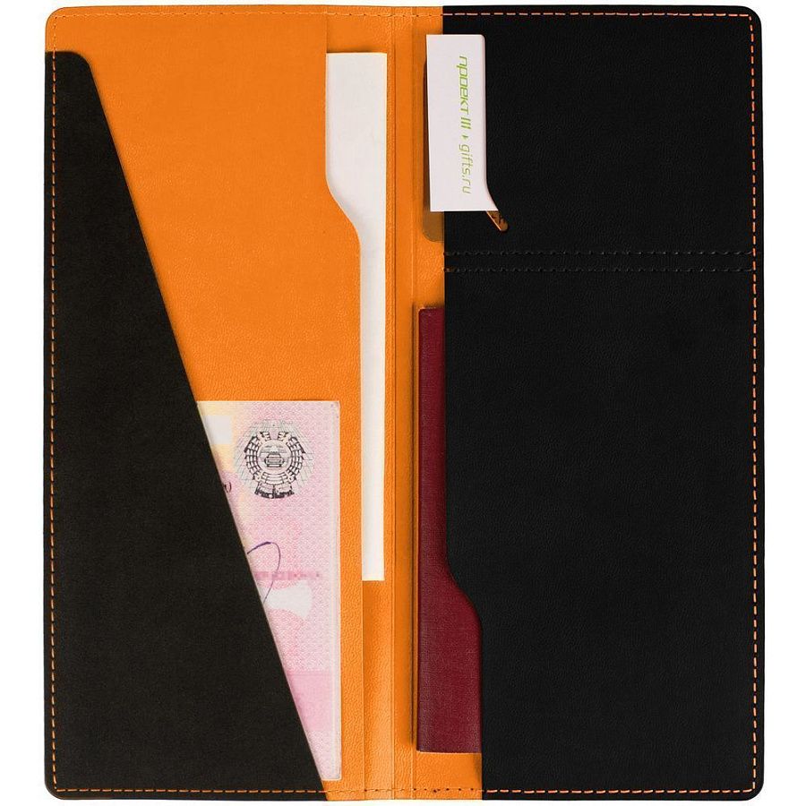 Имеет 5 отделений: для билетов, паспорта, визиток или кредитных карт.