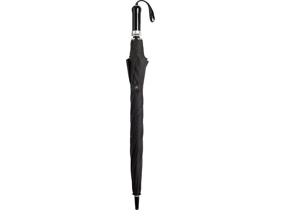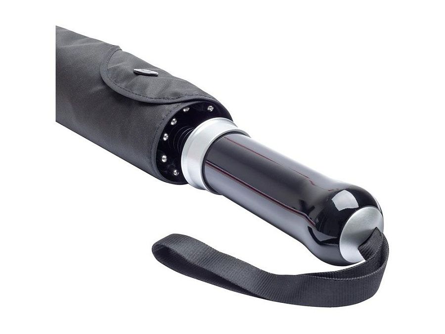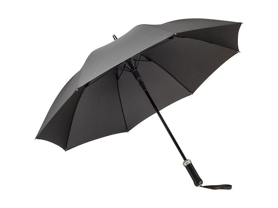 Удобный автоматически открывающийся зонт-трость с уникальной функцией быстрого открытия - нужно потянуть вниз металлическое кольцо на ручке. Купол зонта изготовлен из эпонжа из переработанного пластика, с использованием технологии WaterSAVE, когда окрашивание материала происходит в процессе производства, за счет чего снижает потребление электроэнергии и воды. Высококачественная система защиты от ветра в штормовых условиях обеспечивается гибкими спицами из стекловолокна. Ручка глянцево-черного цвета с хромированными вставками и петлей для переноски. В комплекте чехол, застегивающийся на кнопку.