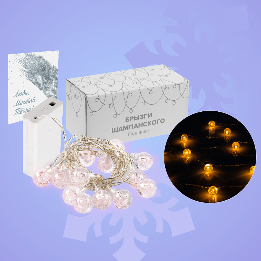 • гирлянда «Брызги шампанского», светодиодная.Состоит из 20 светодиодов с теплым светом. Имеет 2 режима свечения: постоянный свет и мигание. Работает на 3 батарейках типа АА (в комплект не входят).