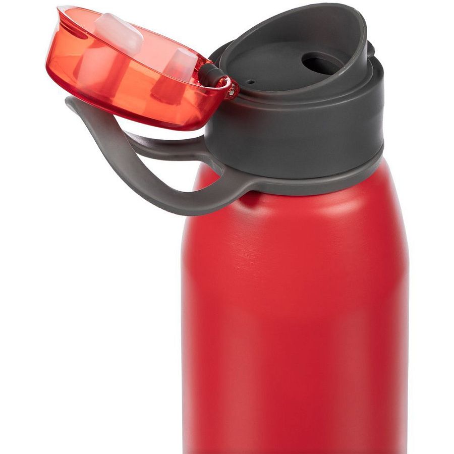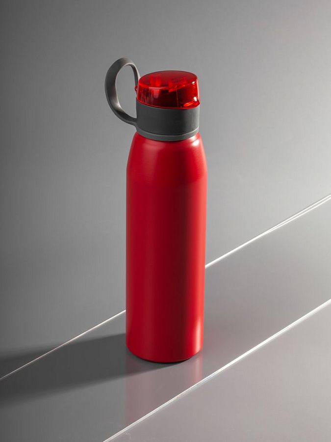 Легкая бутылка для спорта с откидной крышкой и силиконовой петлей для удобной транспортировки.