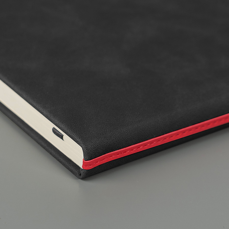 Ежедневник недатированный MuseЦвет обложки черный, декоративная полоса, цвет красныйРазмер 130*210 мм, переплет твердыйОбложка термоактивный PU, с эффектом замшиБлок недатированный, в линейку, скругленные углыБумага кремовая, плотность 70 г м2Форзац нахцаз кремовые272 страницыЛяссе, 7 мм, в цвет обложкиУпаковка крафтовый сливбокс
