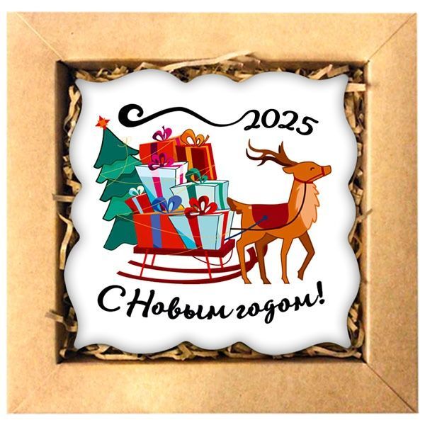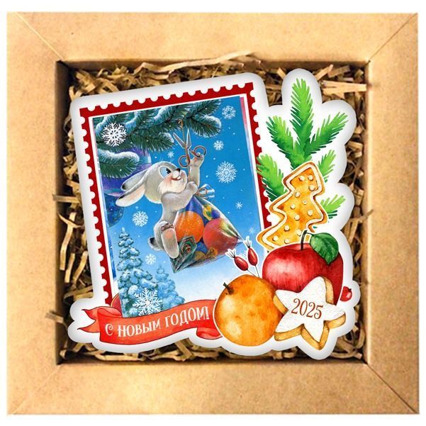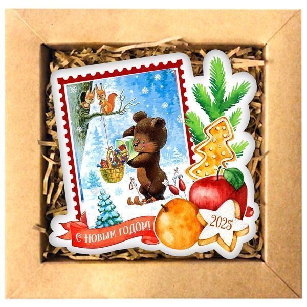 Хрустящее песочное печенье, покрытое шоколадной глазурью, изображение нанесено безопасными пищевыми красителями. Упаковано в крафт коробку.