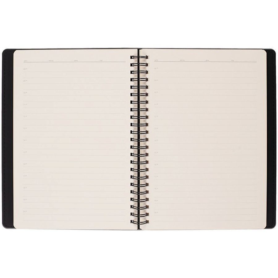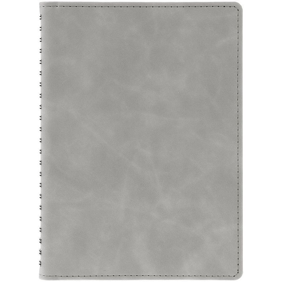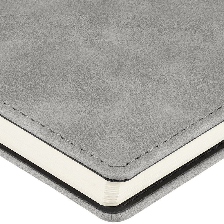 Ежедневник с блоком на пружине в твердой обложке, выполнен из материалов Nubuk Touch, серый СС и Soft Touch, черный AA.
