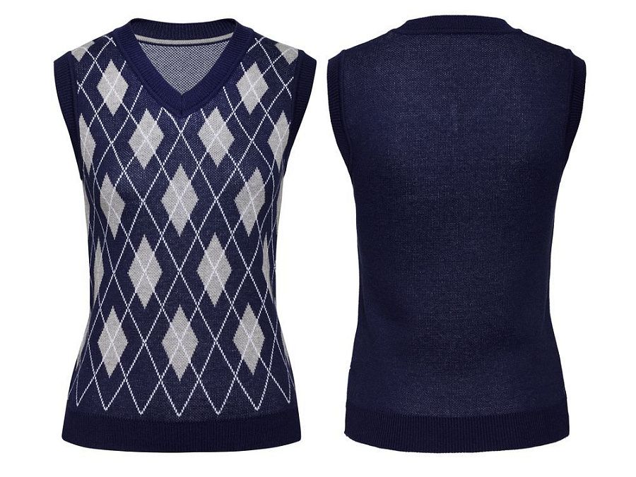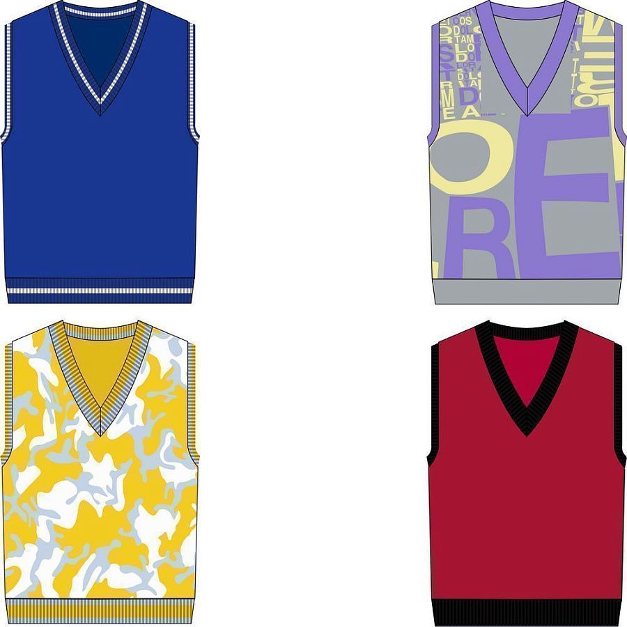 Модель: жилет жаккардовой вязки, плотный и теплый, 2–3 цвета нитей, гладкая поверхность. На бейках горловины и проймы возможна отделка в виде контрастных полос (не более 3-х цветов).