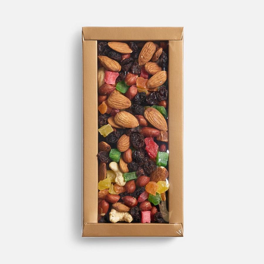 Состав: миндаль, кешью, изюм темный, арахис очищенный, цукаты из ананаса.