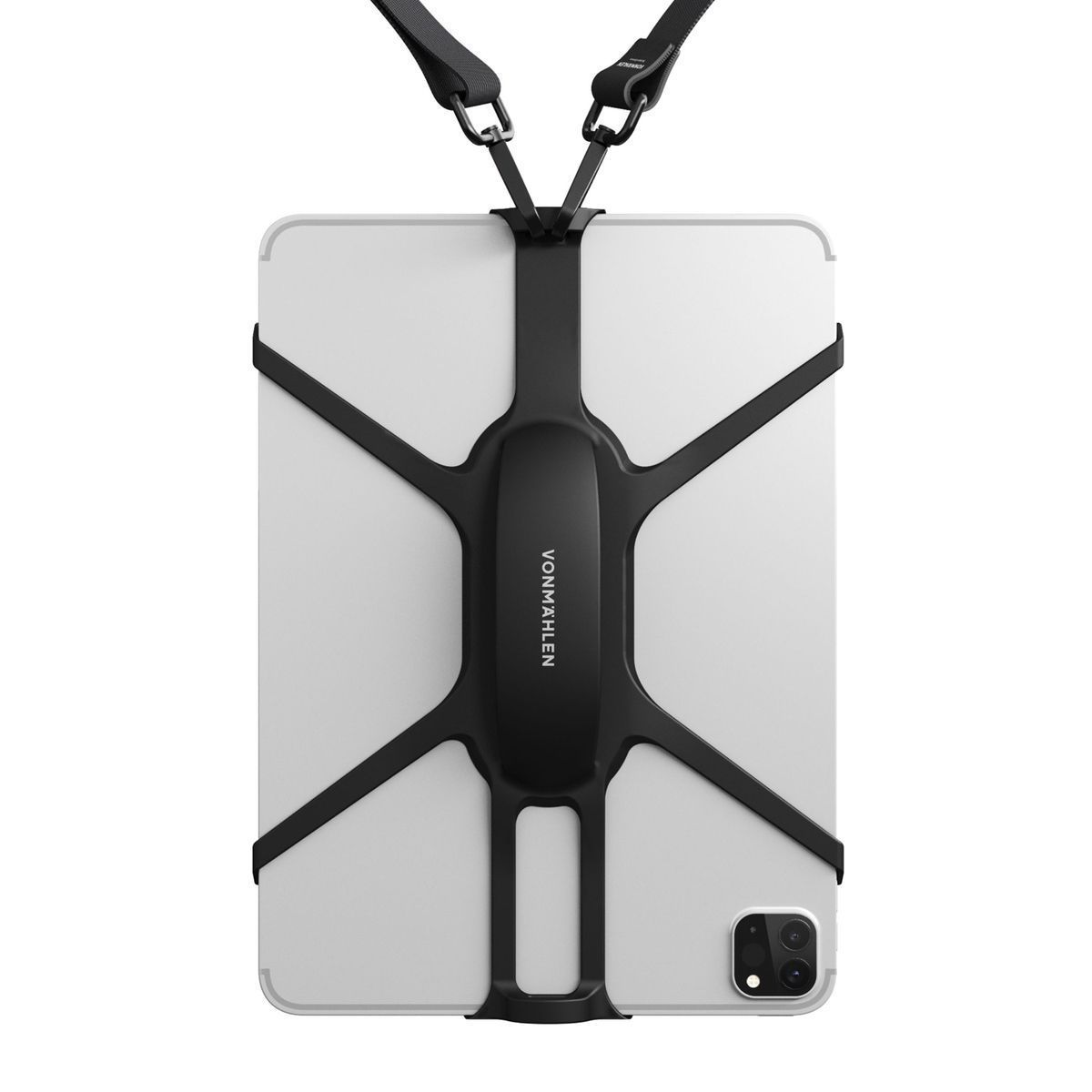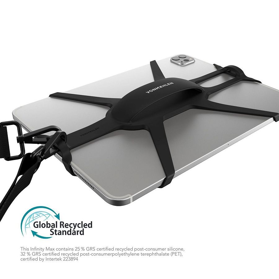 Универсальный ремешок-держатель VONMAHLEN Infinity Max совместим с большинством современных планшетов диагональю от 8 до 11 дюймов. Усиленная ручка по центру изделия обеспечивает надежный и прочный захват. Infinity Max не препятствует использованию функций планшета, поскольку камера и кнопки остаются в легком доступе. Продуманный дизайн позволяет надеть аксессуар за считанные секунды. Длина ремешка регулируется и достигает 170 см. Кстати, благодаря этому Infinity Max можно использовать не только горизонтально, но и вертикально. Еще одна фишка — аксессуар подходит для крепления планшета на спинку автомобильного кресла.