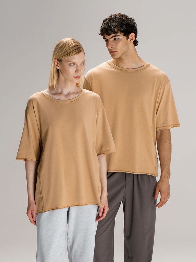 Футболка унисекс свободной посадки Vozduh создана для тех, кто следит за трендами и ценит комфорт. Необработанные края рукавов и низа изделия добавляют ему оригинальности и легкой небрежности, а боковые вставки создают притягательный летящий силуэт.