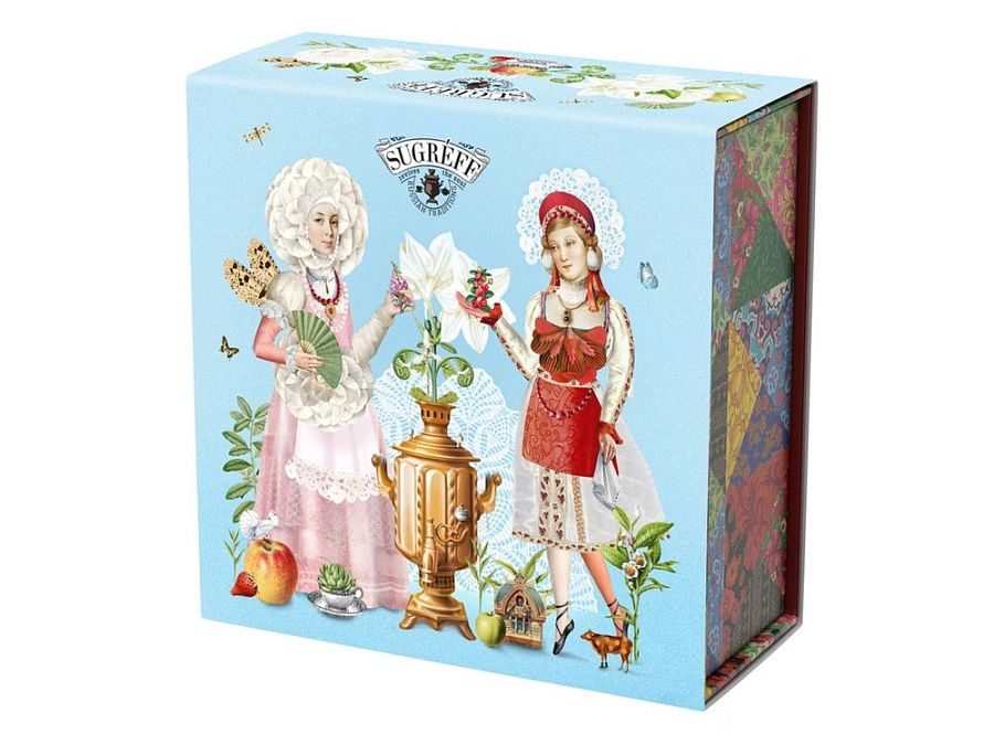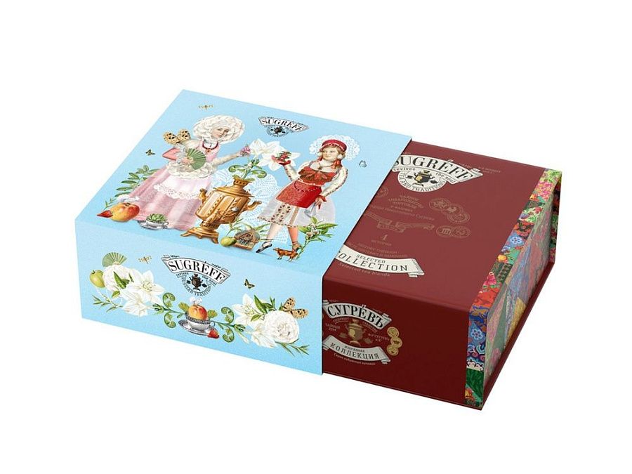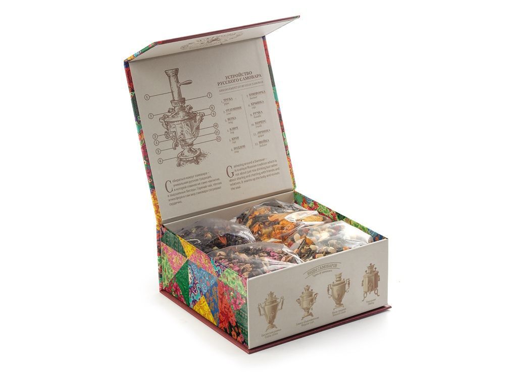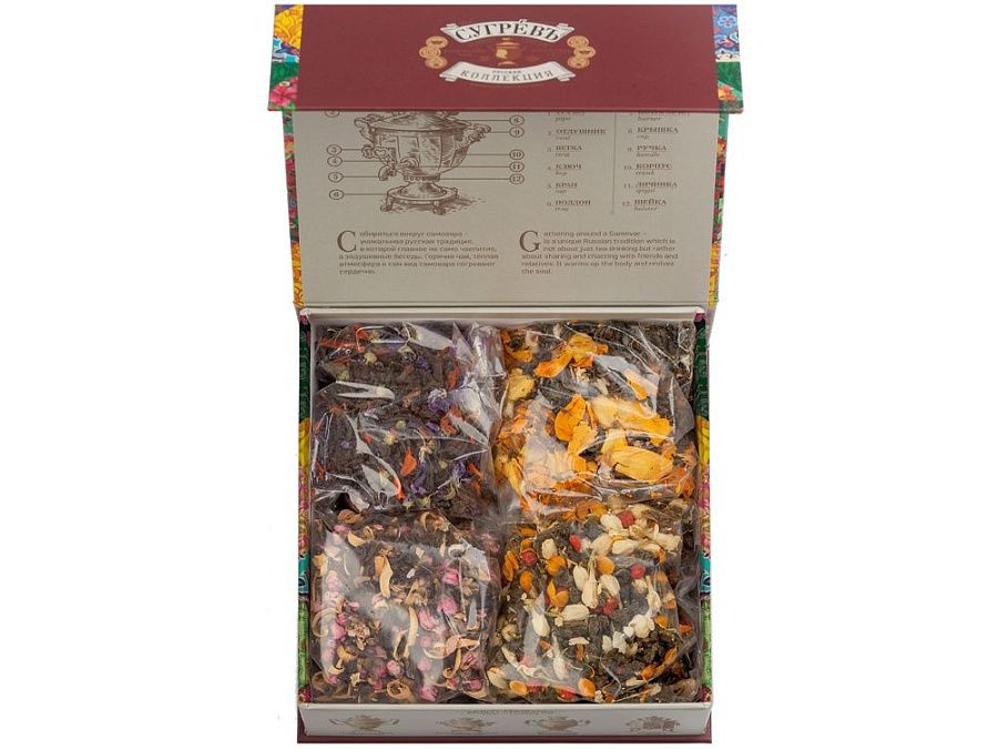 Купажи чая составлены так, чтобы сочетать вкус и аромат отборных сортов китайского и индийского чай с красотой разноцветных лепестков календулы, мальвы, цветов яблони, жасмина, акации и других. Внутри шкатулки находится мини-открытка, которую покупатель может подписать. Состав: Купаж 1: чай зеленый китайский, купальница, цветки яблони, ароматизатор. Купаж 2: тегуань инь, цветы акации, цветы жасмина, ароматизатор. Купаж 3: чай черный индийский, цветы лилии, мальва, ароматизатор. Купаж 4: чай черный индийский ,цветы персика, цветки апельсинового дерева, ароматизатор.