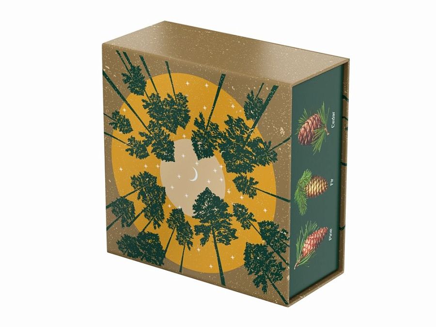 Аромат и вид хвои – символ Рождества и Нового года. «Хвойная» шкатулка «С сосновым годом!» оформлена праздничным паттерном и изображением шишек разных хвойных деревьев. На крышке шкатулки помещена иллюстрация, изображающая вид снизу вверх на звёздное небо и уходящие ввысь сосны. При надевании на шкатулку шубера (суперобложки) с круглым отверстием, на крышке шкатулки появляется вырубное изображение новогоднего шарика.