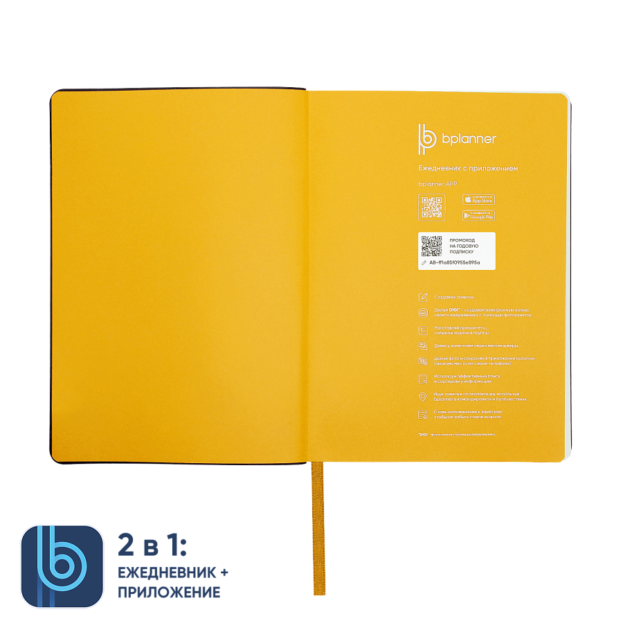 Bplanner 01изготовлен в широкой цветовой линейке из экокожи в фактуре софт-тач. У ежедневника гибкая обложка, цветной форзац и нахзац и ляссе в цвет обложки. Модель характеризуется широкой цветовой линейкой. Ежедневник подходит для УФ-печати и тиснения логотипа компании. На форзаце ежедневника расположен qr-код, который активирует годовой доступ к мобильному приложению Bplanner.