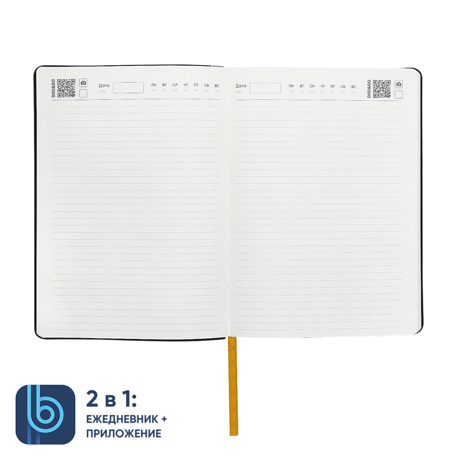 DIGI– фотоснимок страницы ежедневника. На каждой странице ежедневника расположен QR код, который открывает режим камеры сразу в приложении. Остается только нажать кнопку.