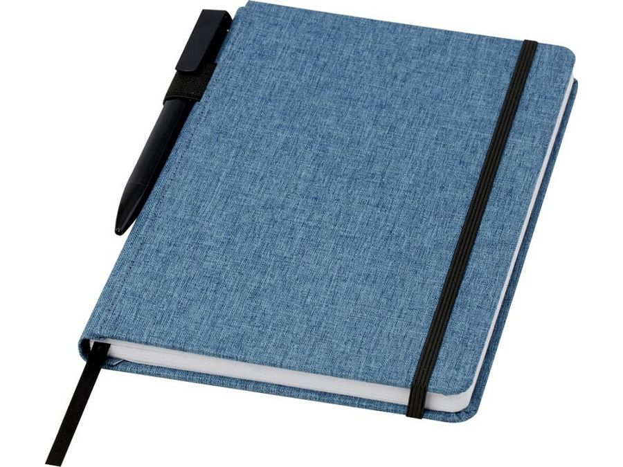 Блокнот формата А5 с отделкой из переработанного ПЭТ. Содержит 96 листов в линию плотностью 70 г/м², изготовленных из переработанной бумаги, с петлей для ручки и лентой-закладкой. В упаковке из картона.