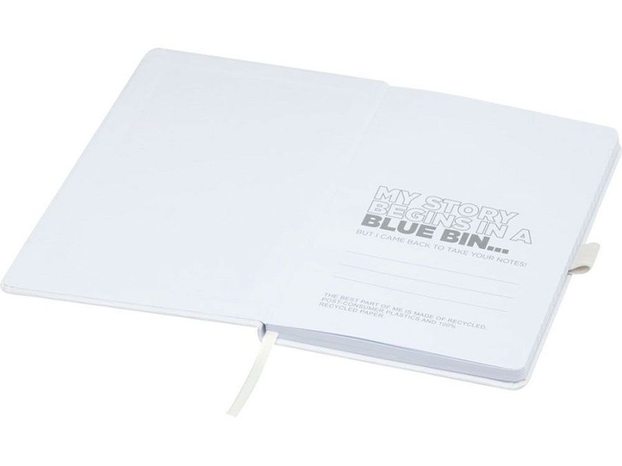 Блокнот формата А5 с обложкой из переработанного ПЭТ. Содержит 80 листов в линию плотностью 70 г/м², изготовленных из переработанной бумаги, с петлей для ручки и лентой-закладкой. Может быть дополнен шариковой ручкой Honua 107757 из переработанного ПЭТ. Переработанный PET пластик.