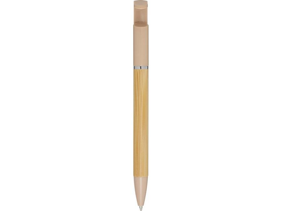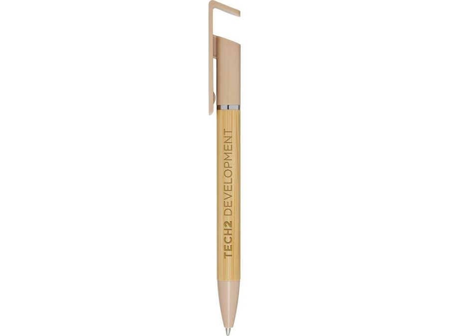 Бамбуковая шариковая ручка, которая также может служить подставкой для телефона. Кнопка и среднее кольцо изготовлены из переработанного пластика, наконечник — из латуни, а корпус — из бамбука, полученного из ответственных источников. Цвет чернил: черный. Длина непрерывной линии: 1000 метров. Размер пера: 1,0 мм. FSC certified bamboo. FSC Mix Credit N5 CU-COC-877277.