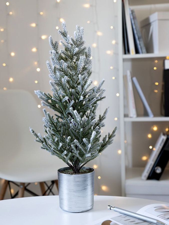 Подставка создает ощущение, что в дом занесли настоящее растение в горшке, а веточки, словно покрытые снегом, добавляют особой атмосферности и праздничности. С литыми иголками хвоя выглядит натуральнее, а силуэт елочки — живее и реалистичнее.