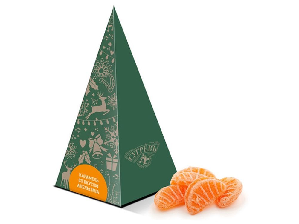 Картонная ёлка с выборочным УФ-лаком с натуральными леденцами со вкусом апельсина. Прекрасное дополнение к любому подарку на Новый Год и Рождество. Яркая праздничная упаковка и интересное наполнение.