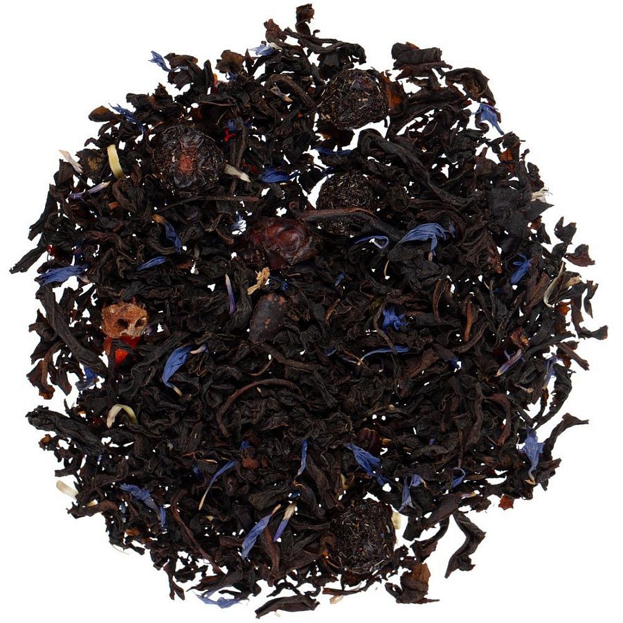 Черный цейлонский чай с ягодами вишни и лепестками василька имеет терпкий насыщенный вкус с цитрусовой кислинкой и сладкими нотками.Состав: чай черный крупнолистовой, вишня черная сушеная, цедра шиповника, лепестки василька, пищевой ароматизатор «Бергамот».