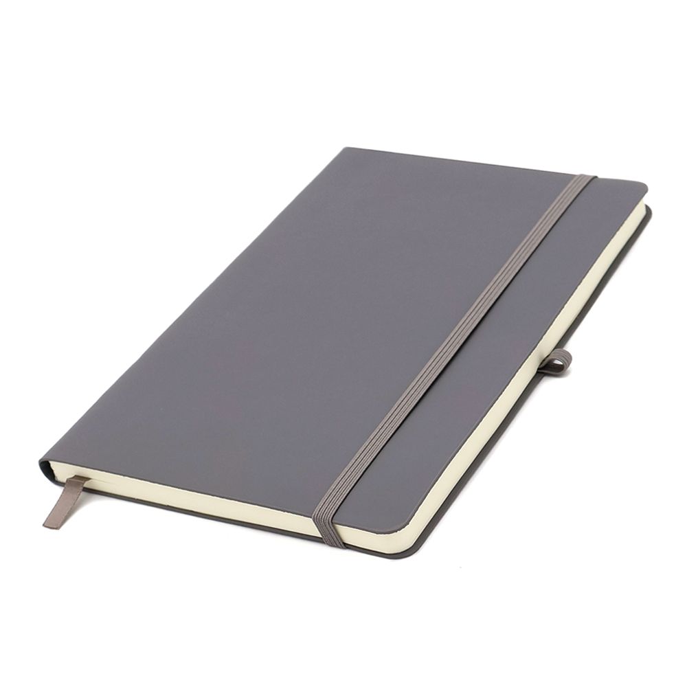 Блокнот формата А5 с мягким покрытием из PU-материала с имитацией рисунка кожи, с эластичной застежкой и текстильной закладкой, наличие петли для ручки в цвет блокнота, 192 страницы, плотность 70г/м, страницы с черными линиями. Цвет по PANTONE® (максимально приближен): Cool Gray 10 C.