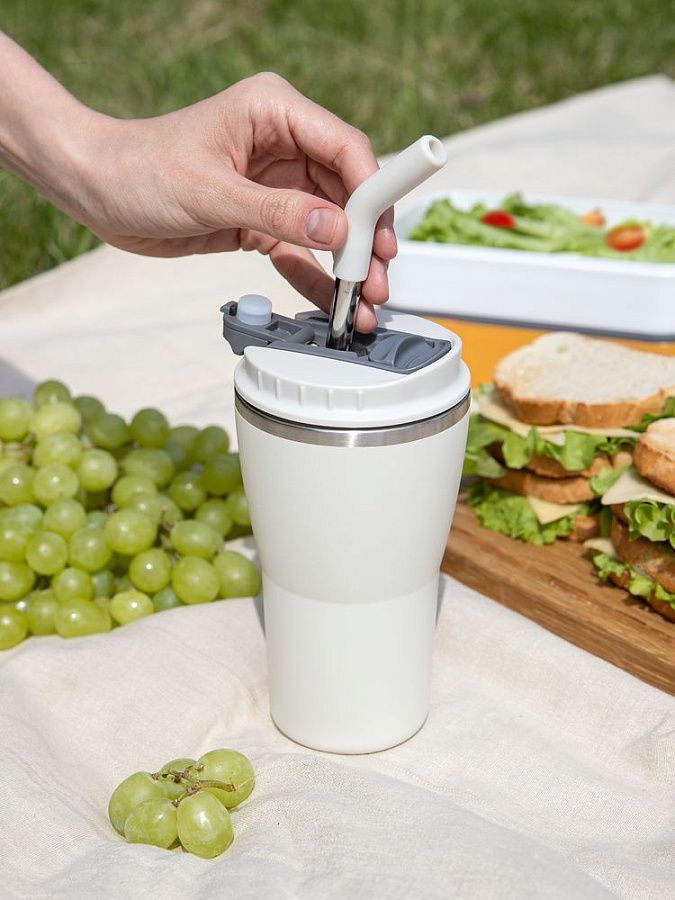 - 2 крышки в комплекте: одна на 100% герметичная с механизмом блокировки отверстия для питья, вторая — с отверстием для трубочки