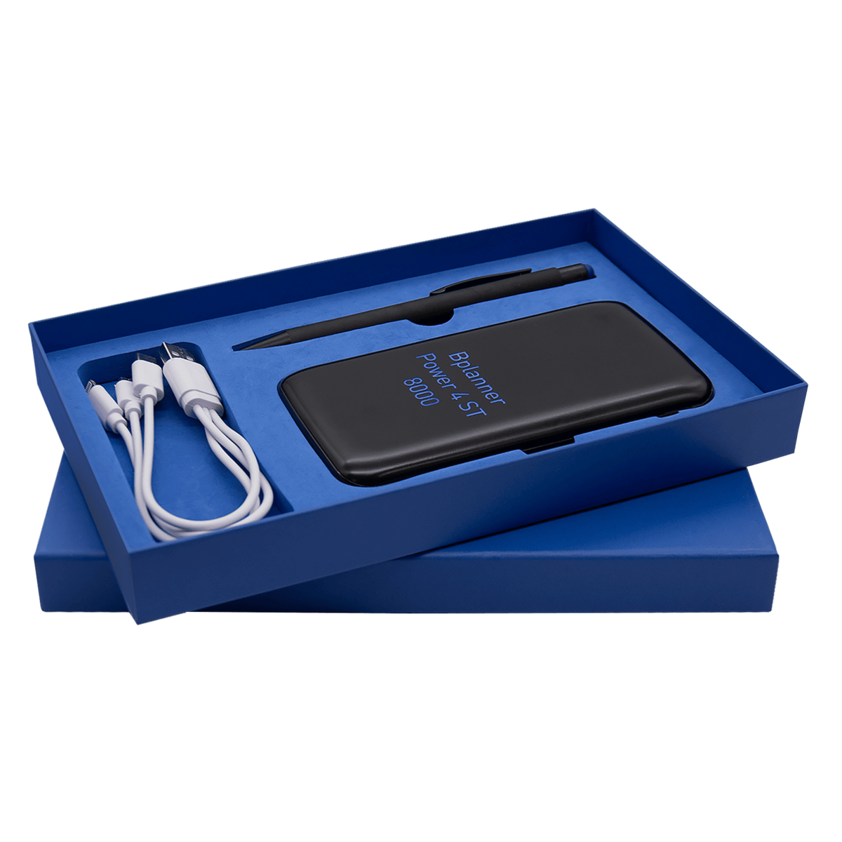 Набор Bplanner Power– отличный вариант для welcome pack! Он содержит все самое необходимое: емкий внешний аккумуляторBplanner, металлическую ручку и подарочную коробку с цветным ложементом.