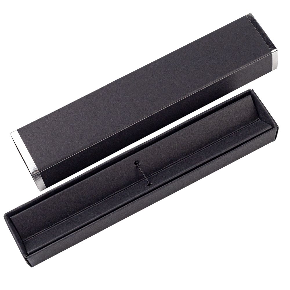 Бумажная коробочка для ручки. Ложемент V-образный с резинкой, фиксирующей ручку. По краям крышки металлизированные декоративные элементы, для красоты. В такой коробочке подаренная ручка будет выглядеть ещё дороже, словно фотомодель в вечернем платье.