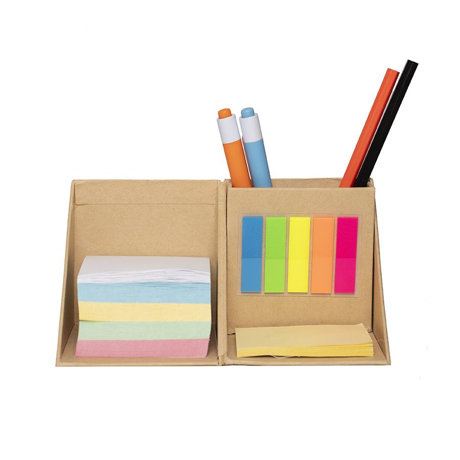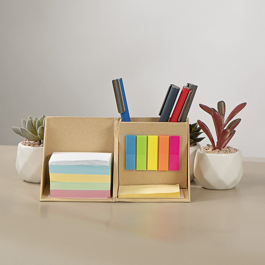 Компактный и функциональный настольный аксессуар из крафтового картона, включает в себя отделение для пишущих принадлежностей, блок бумаги для записи 7,4*7,4 см 500 л, блок бумаги для заметок с клеевым краем 7,5*5 см 50 л и набор пластиковых закладок с клеевым краем 5цв по 25 л.• Размер настольного набора:в сложенном виде 9 х 9 х 9 см,в разложенном виде 18,5 х 9 х 8,52 см