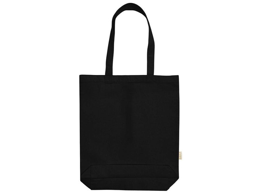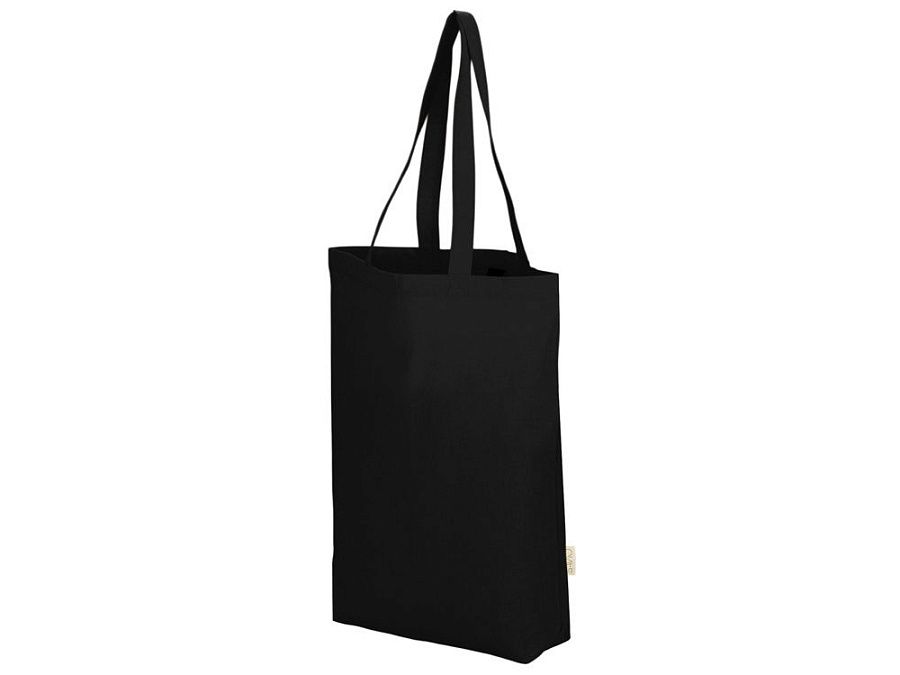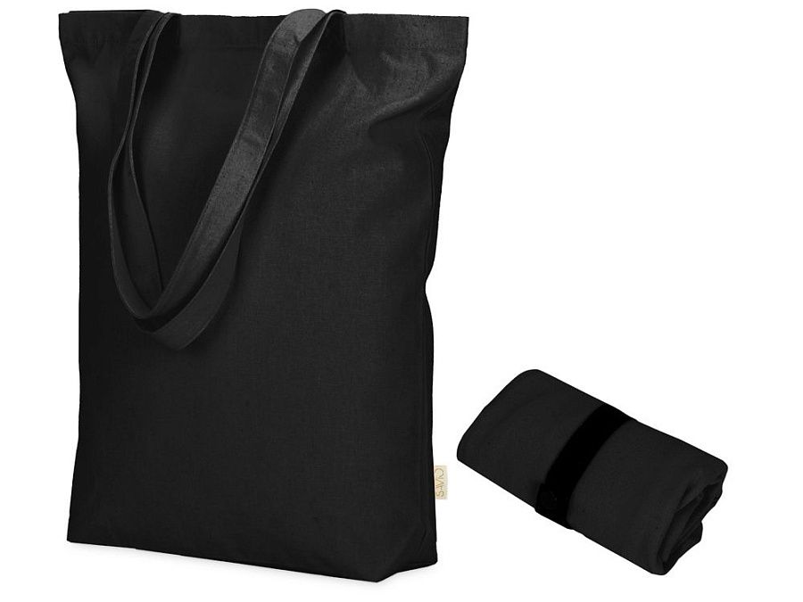Удобная сумка-шоппер из переработанного хлопка. Можно хранить в сложенном виде и фиксировать с помощью эластичной ленты, застегивающейся на кнопку.