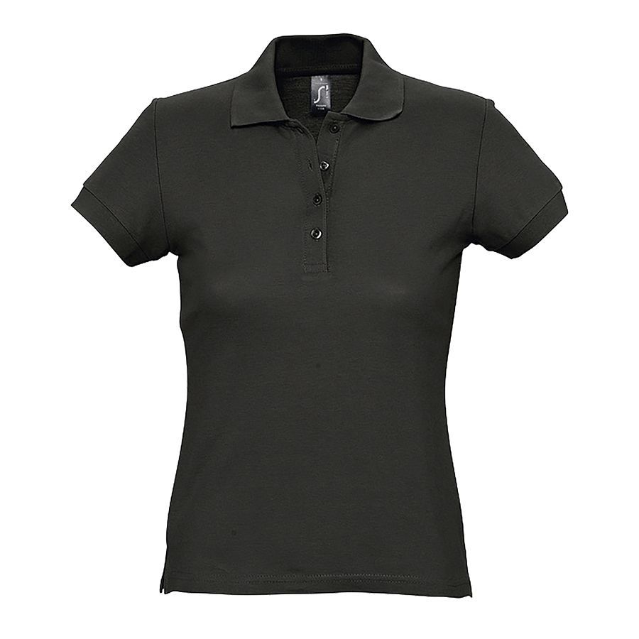 Приталенное женское поло.Прямой низ, боковые разрезы. Рукав короткий.Воротник и манжеты из эластичной резинки-рибаны.Ворот укреплен тесьмой.4 пуговицы в тон изделия на планке.Запасная пуговица на внутреннем боковом шве.Цвет близкий к PANTONE 426C