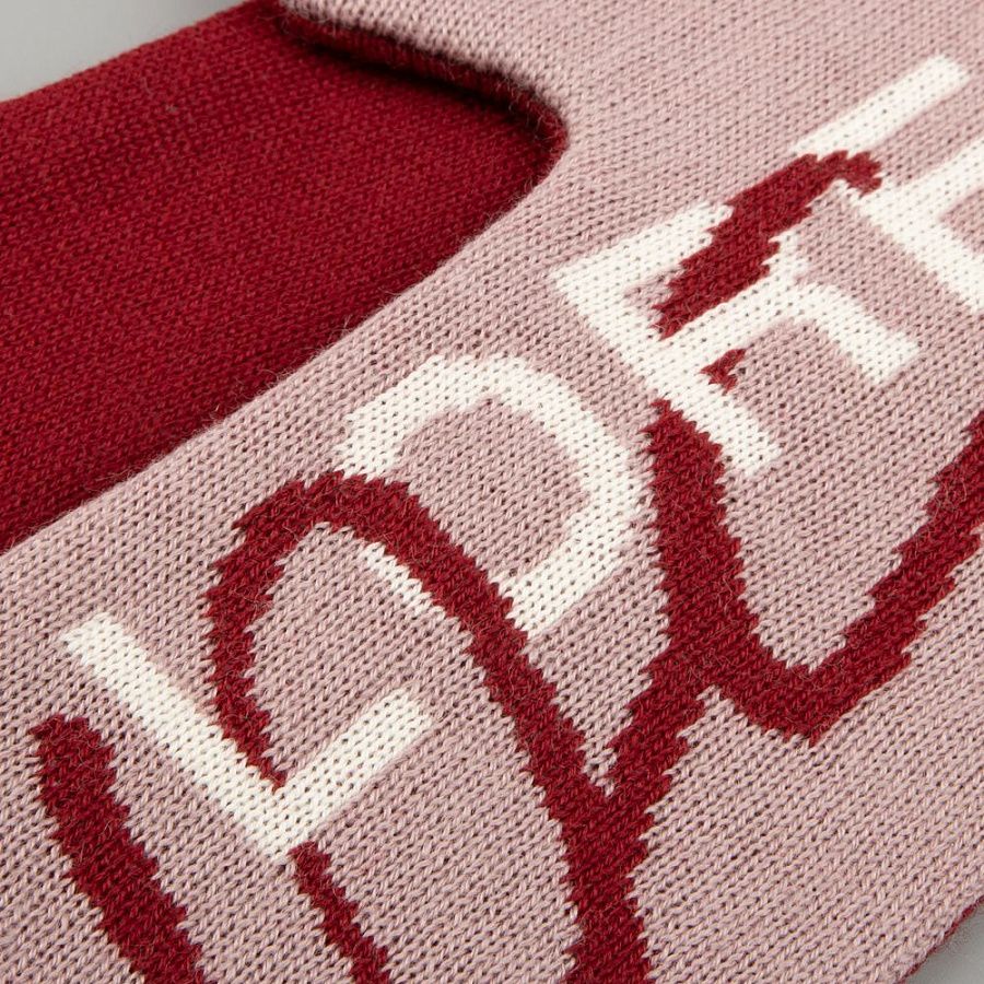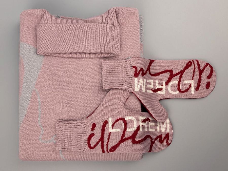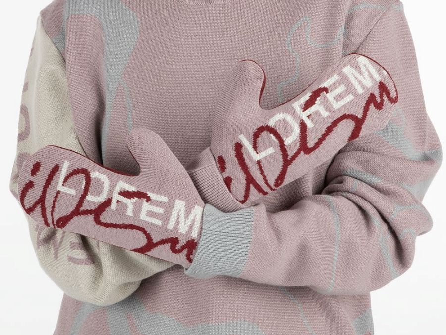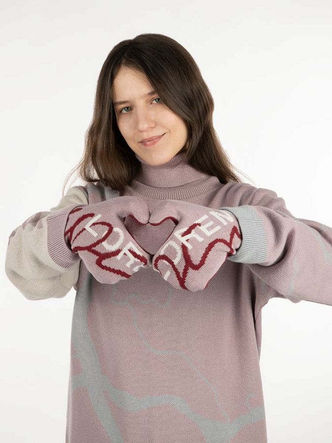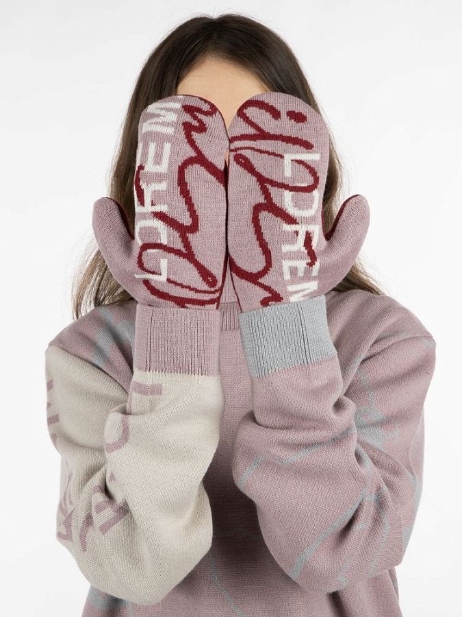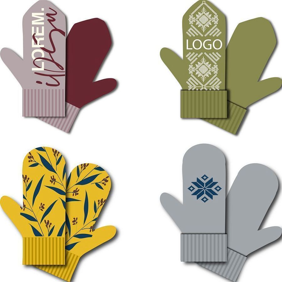 Варежки с вывязанным логотипом и индивидуальным рисунком в фирменной цветовой гамме.