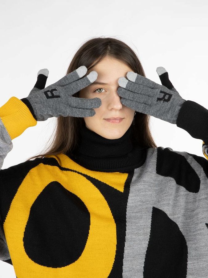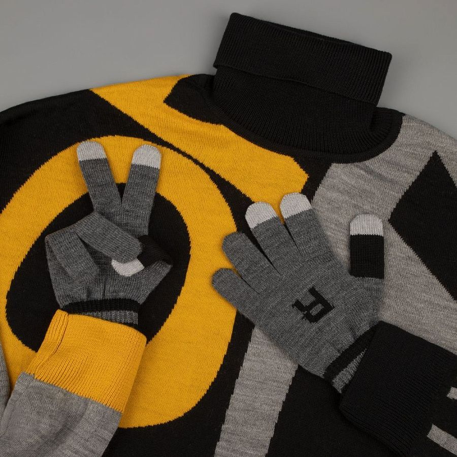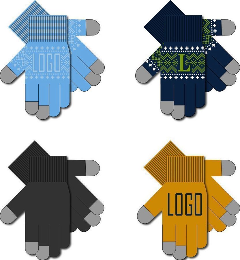 Модель: цельновывязанные бесшовные перчатки с эластичной манжетой и жаккардовым узором в 2-3 цвета. Три пальца: средний, указательный, большой — вяжутся с использованием токопроводящей нити. Манжета может быть полосатой (только горизонтальные полосы 1-2 цветов, без узора и логотипа).