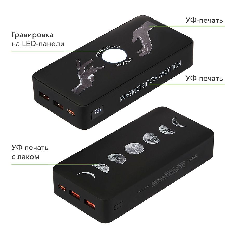 Проявите свою индивидуальность с помощью УФ-печати или гравировки. Увеличенная LED панель позволит создать уникальный аксессуар. Техническая информация вынесена на боковую грань.