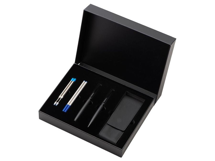 В набор входят шариковая ручка и роллер. Швейцарский пишущий узел Premec и немецкие чернила Dokumental обеспечивают мягкое и плавное письмо. Корпус каждой ручки имеет анодированный слой, благодаря которому гравировка получается с зеркальным эффектом.В набор входит также пенал для двух ручек, который также можно брендировать.