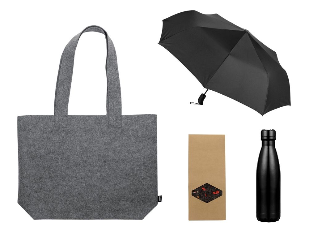 Набор подойдет как для городских прогулок, так и для выездов на природу. Термобутылка сохранит ваш напиток горячим, а зонт защитит от дождя.