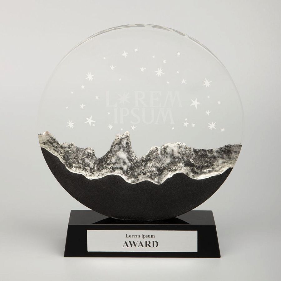 Прозрачная круглая часть и черное основание стелы изготовлены из премиального стекла К9, в основе которого лежит оптическое боросиликатное стекло. Эту марку стекла отличает низкий процент посторонних включений, высокий показатель преломления и высокая прозрачность — идеальные качества для изготовления наград премиального уровня.