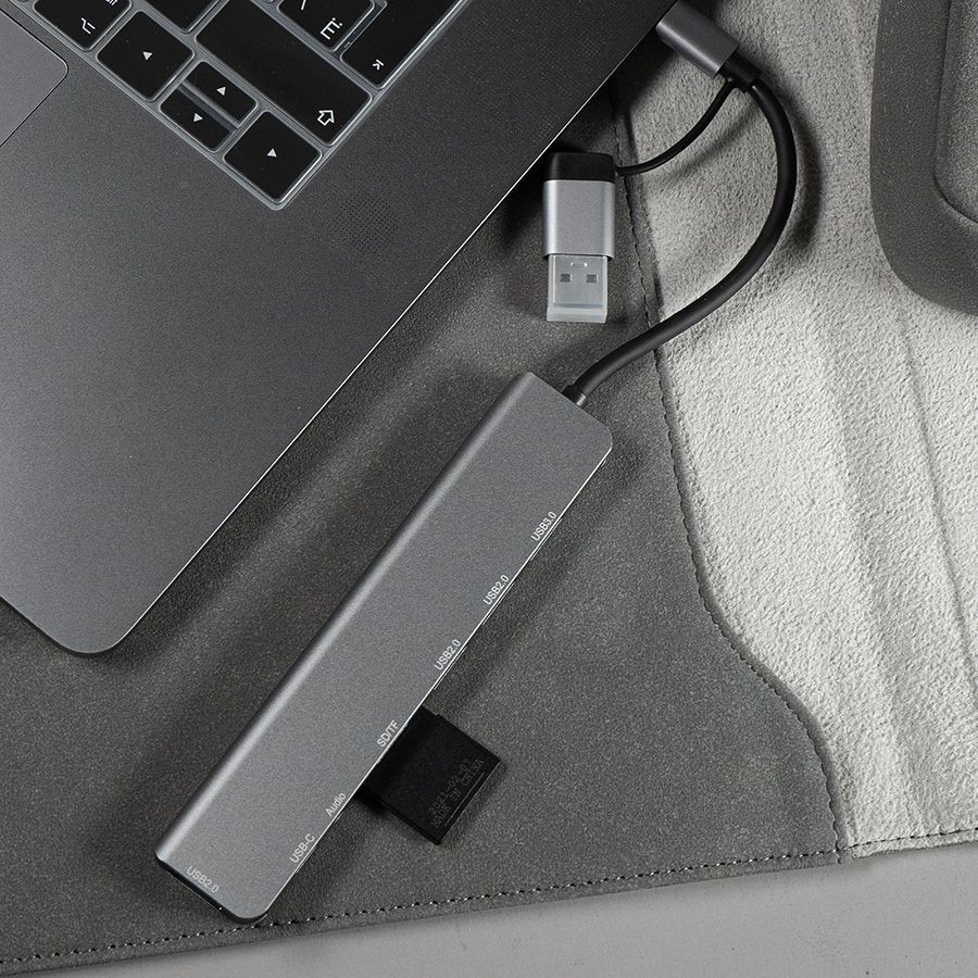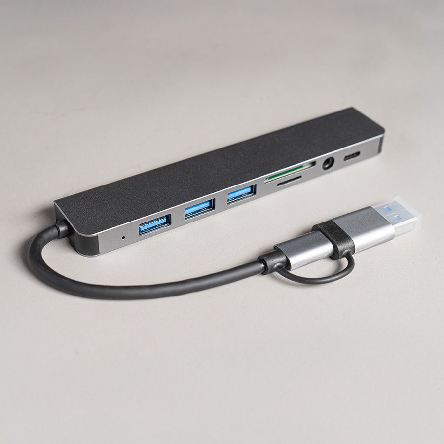 USB-хаб в алюминиевом корпусе оснащен 3-мя разъемами USB 2.0 и 1-им разъемом USB 3.0, а также 1-им разъемом USB Type-C, считывателем MicroSD и SD карт, разъемом Jack 3,5 мм. Устройство в совокупности имеет 8 разъемов и 2 способа подключения: USB-A и USB Type-C, что делает его многофункциональным и удобным в использовании. USB Хаб не требует дополнительного питания, так как питание устройств, подключенных для синхронизации и подзарядки, осуществляется от порта компьютера ноутбука. Работает со смартфонами, которые поддерживают функцию OTG (большинство современных смартфонов). Технические характеристики:Материал корпуса: алюминийКоличество разъемов USB 2.0 3Количество разъемов USB 3.0 1Количество считывателей карт MicroSD 1Количество считывателей карт SD 1Количество разъемов Jack 3,5мм 1Количество разъемов USB Type-C 1Тип подключения: USB-A, USB Type-C 1 Совместимые устройства: мобильный телефон, персональный компьютер, ноутбук