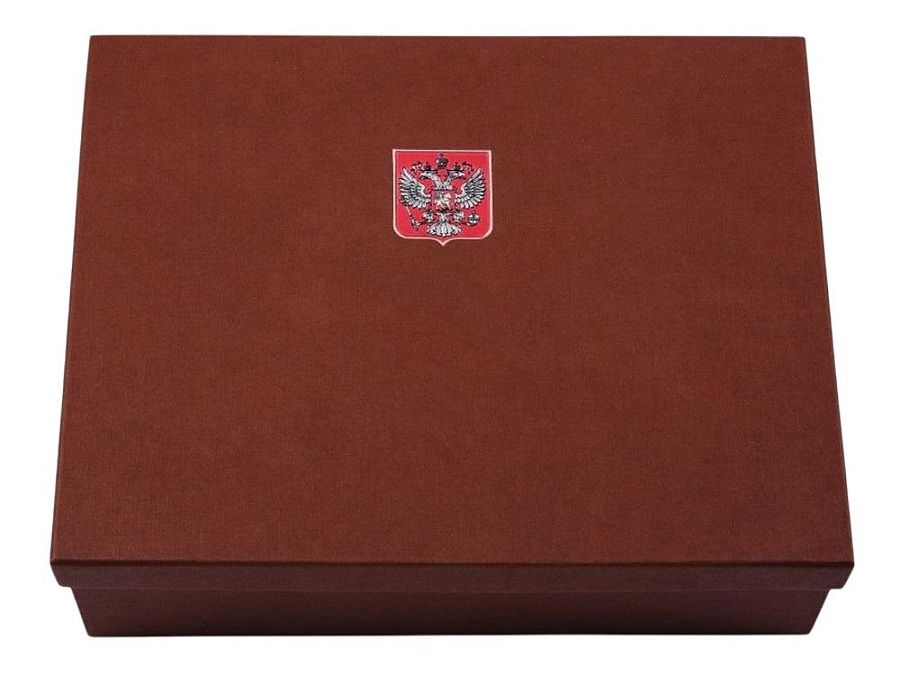 Ежедневник формата А5 с декором "Герб РФ на щите" и фарфоровая чайная пара с золотой отводкой края чашки и блюдца декорированная металлическим барельефом "Двуглавый орел".