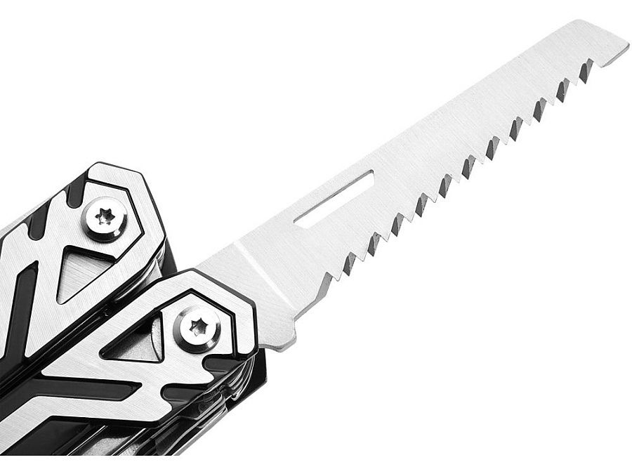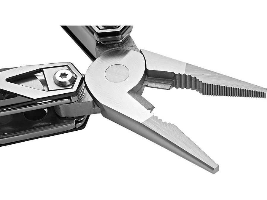 Универсальный мультитул предлагает 21 функцию, включая плоскогубцы с игольчатым наконечником, обычные плоскогубцы, кусачки для проволоки, нож с плоской кромкой, магнитную отвертку с 8-функциональными насадками, линейку / напильник, зазубренный нож, открывалку для бутылок, консервный нож, шило, мини-отвертку с прорезями. Все функции оснащены предохранительной блокировкой.