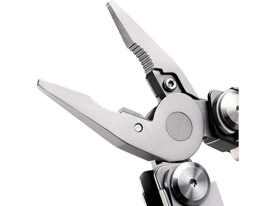 Многофункциональный инструмент объединяет в себе: пассатижи, плоскогубцы с игольчатым наконечником, нож, пилу, кусачки, кусачки для многожильной проволоки, сменный резак жесткой проволоки, линейку, ножницы, стеклобой, открывалку для бутылок, открывалку для консервных банок, шлицевую отвертку, крестовую отвертку, инструмент для зачистки проводов от изоляции и крюкорез. Длина инструмента в сложенном виде составляет всего 11 сантиметров.