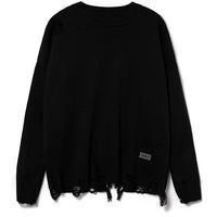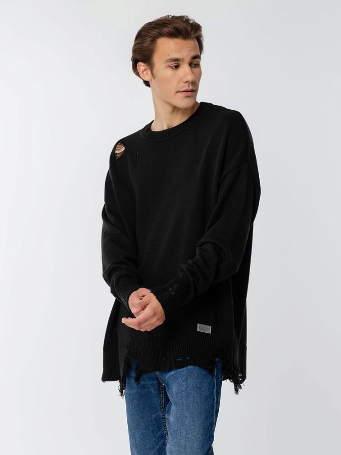 Оверсайз джемпер с круглым вырезом и рваными краями. Ворот, манжеты и низ изделия выполнены резинкой.