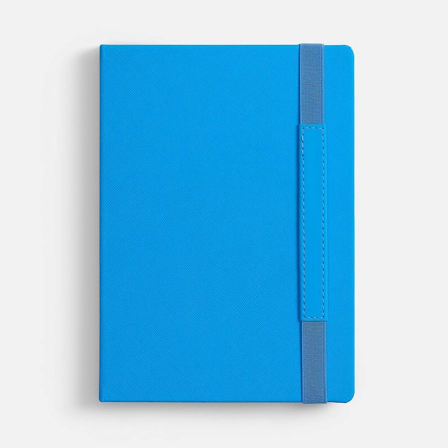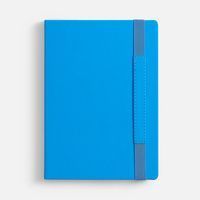 Ежедневник с твердой обложкой, выполнен из материала Nice Touch, голубой JJ, дополнен резинкой с шильдой из материала Soft Touch Ultra и ляссе в цвет обложки.
