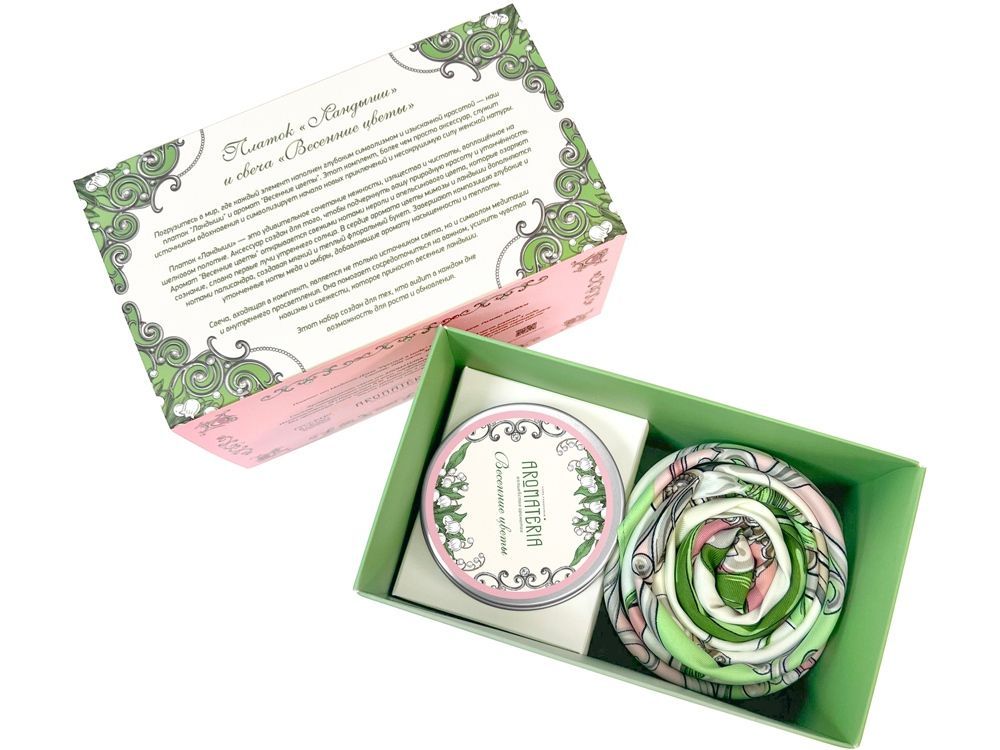 15 х 8,5 х 8,5 см, платок 90 х 90 см, свеча d6,5 х 5